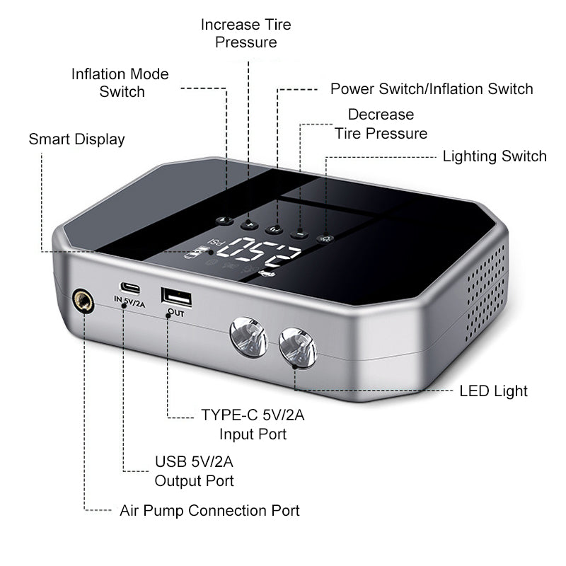 Produktfunktioner: Nödstart / Däckpumpning / Laddning / Belysning