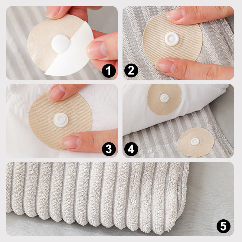 ENKEL ATT ANVÄNDA: Ta bort den självhäftande filmen, fäst en del på påslakanet och den andra på täcket, och knäpp ihop dem för en säker passform—snabbt, enkelt och pålitligt.