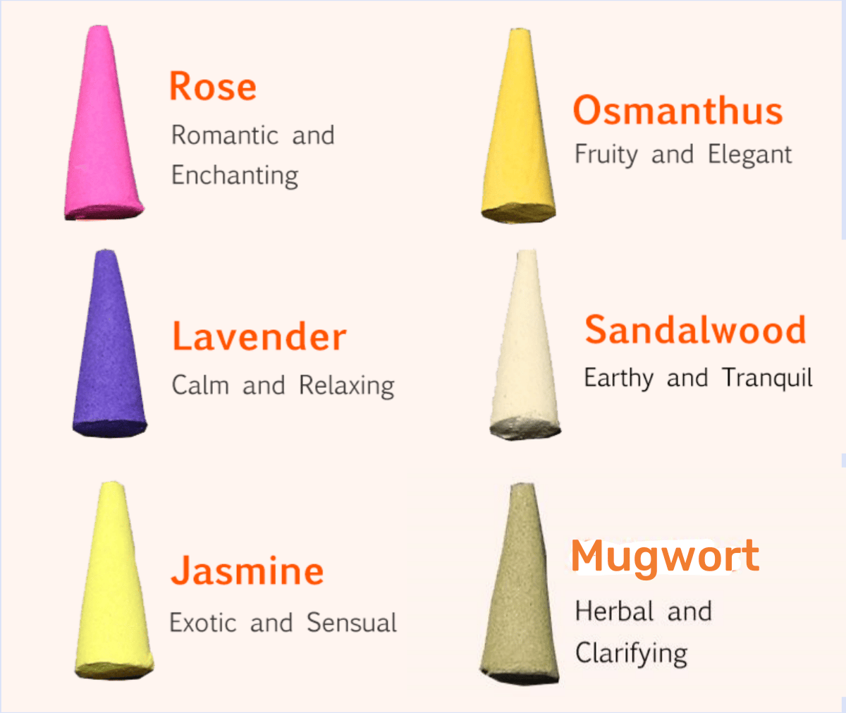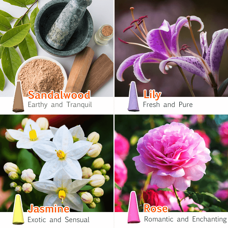 Ros: Romantisk och förtrollande; Lavendel: Lugnande och avslappnande; Jasmin: Exotisk och sensuell; Osmantus: Fruktig och elegant; Sandelträ: Jordnära och lugnande; Nypon: Örtig och uppklarande.