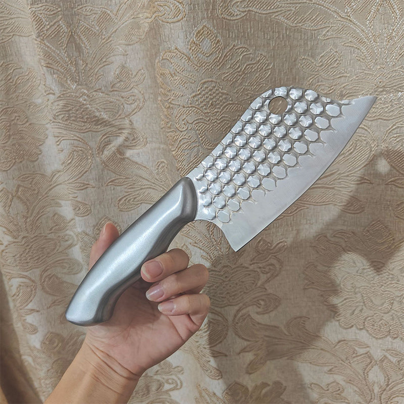 PrĂ€glad drakskalstextur pĂ„ bladet skapar smĂ„ luftfickor mellan kniven och maten â eliminerar fastklibbande och minskar friktion! Skiva grönsaker, tĂ€rna kött eller urfisken utan rörig uppbyggnad, sĂ€kerstĂ€ller rena, precisa skĂ€rningar varje gĂ„ng. Inget mer att skrapa mat frĂ„n bladet mitt i förberedelse.