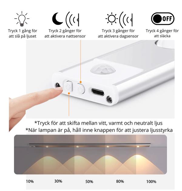 Du kan enkelt växla mellan tre olika typer av ljus - varmt, neutralt och vitt. Du kan också justera själva ljusstyrkan så att den passar perfekt i ditt hem. Rörelsedetektorn gör att ljuset aktiveras när rörelse upptäcks, även i mörker.